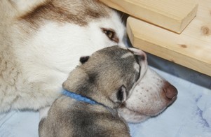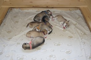 Leider nahm Mama "Alvari" die Welpen nach der Geburt nicht gleich an und stoß sie zuerst ab. Nach drei Tagen und der tatkräftigen Hilfe von Ersatzmama "Soraya" in dieser Zeit, entwickelte "Alvari" doch Muttergefühle und begann sich rührend um die Kleinen zu kümmern.