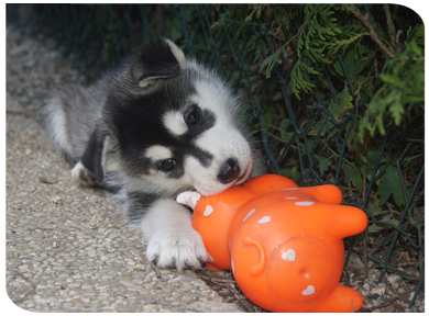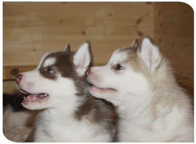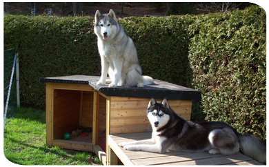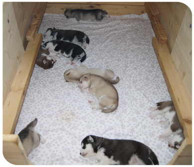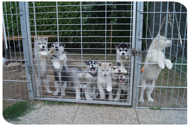 Unsere Welpen werden im Haus in einer eigens angefertigten Wurfbox geboren und wachsen in den ersten drei Wochen mit der Mutterhündin unter ständiger Beobachtung im Haus auf. Sobald die Kleinen selbstständig die Wurfbox verlassen können, übersiedeln sie in ihr neues Zuhause nach draußen in den Garten. Das Welpengehege wurde liebevoll von uns gestaltet und bietet den Welpen unterschiedliche Bodenbeschaffenheiten, einen Hundeswimmingpool im Sommer und eine vollisolierte Hütte, die vor Regen und Schnee schützt. Außerdem können die Welpen durch den Zaun bereits erste Kontakte mit unserem Rudel aufnehmen, was unserer Meinung nach für die weitere soziale Prägung der Welpen sehr wichtig ist.